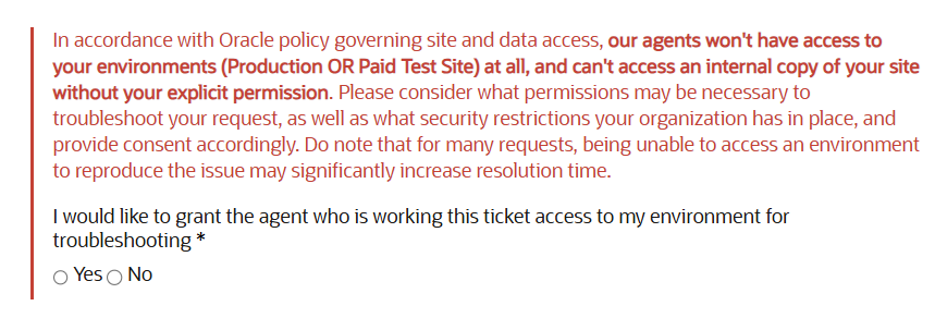 When filling out the Submit a Service Request form, you will be able to select the access granted to Support. Support engineers will not access any of your environments (production, test, upgrade, etc). Support engineers will only make and access copies of your environment with your explicit permission. Please note that failure to grant access for any of the options shown below may significantly delay the resolution of the Service Request.