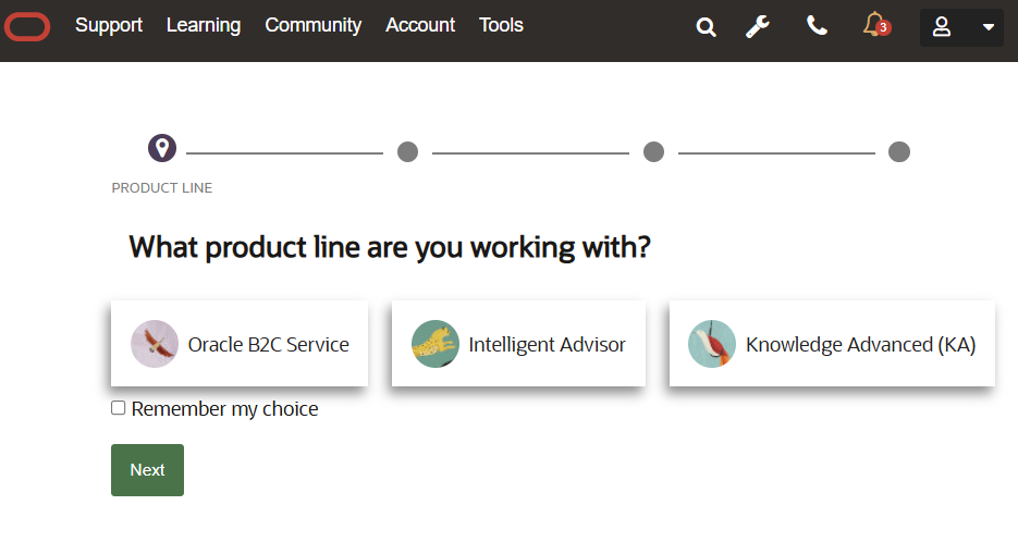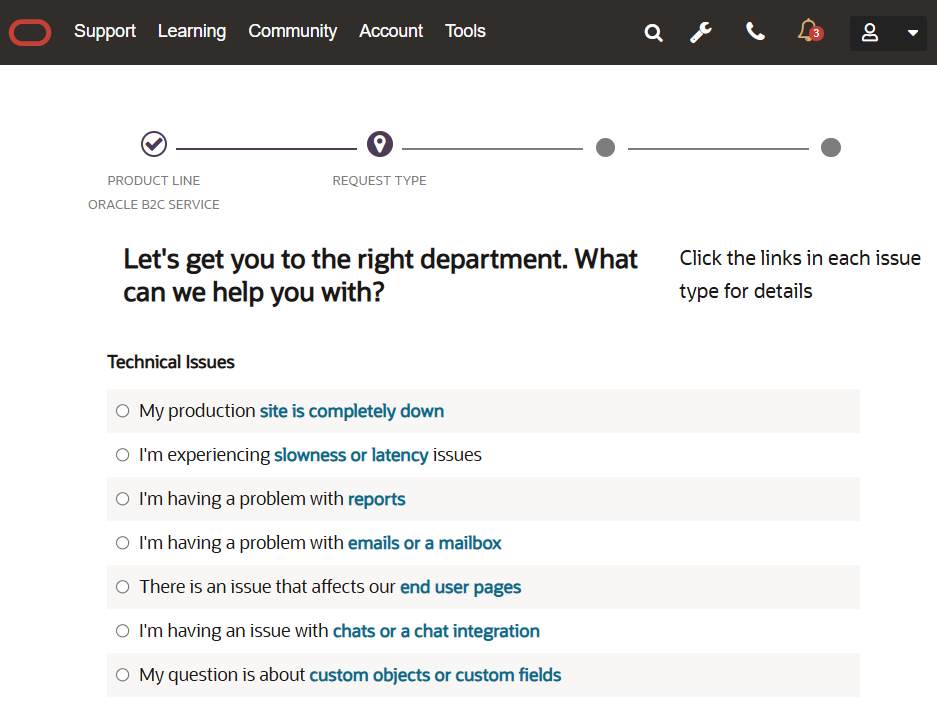 General guidance or consultative questions should be addressed by our variety of self-service options, such as searching the knowledgebase or the posting to the B2C Service Cloud Customer Connect community forums. Please see Answer ID 9704: Requesting Assistance from Oracle B2C Service Technical Support for details on the types of issues that Oracle B2C Service Technical Support can assist with.